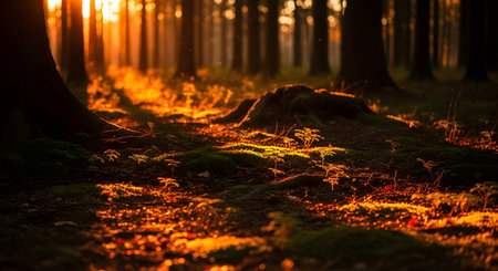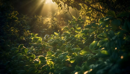 Sunbeams filter through tall trees in serene forest, creating beautiful silhouettes and illuminating lush undergrowth. warm light enhances tranquil atmosphere, inviting peace and reflection