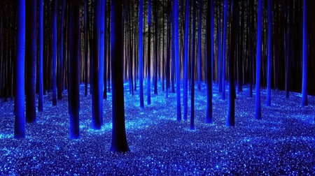A forest at night with a vibrant and colorful display of leaves glowing in the dark. The leaves are illuminated with a variety of colors, creating a serene and peaceful atmosphere