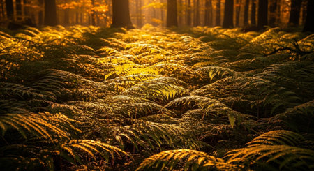 Sunlit autumn forest, leaves crunch underfoot generated by artificial intelligence