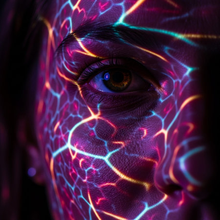 Square 1:1 format. Extreme close-up on the human eye and surrounding facial area, lit dramatically b