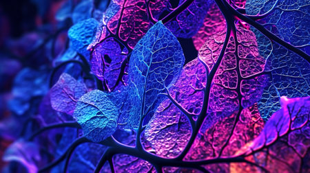 abstract background of neon leaves in blue and purple tones, toned