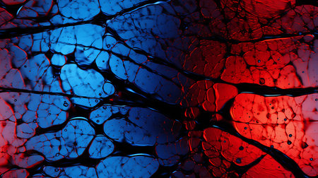 Macro view of human blood vessel network with red and blue tones showing capillaries and vein structure, ideal for illustrating medical anatomy and biology research.