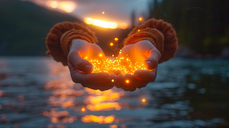 Woman holding glowing magic dust in open hands, creating a sparkly effect with bokeh and orange light on a dark background, concept of magic, spirituality, and fantasy