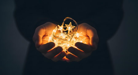 Close up of a person's hands holding a tangle of warm, glowing star shaped string lights against a dark background, creating a magical and hopeful feeling.