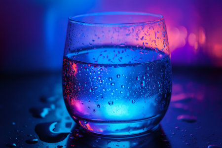 Glass of water with condensation under colorful neon lights creating a vibrant and refreshing atmosphere