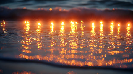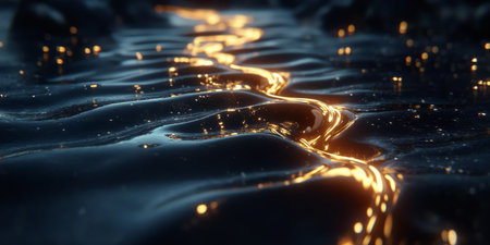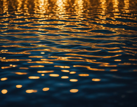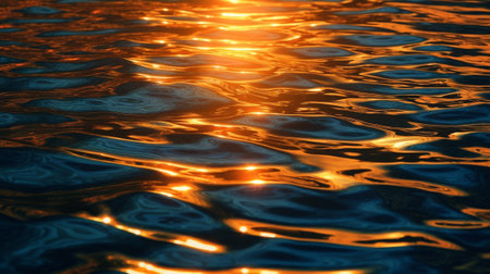 Shimmering surface of water reflects golden hues, creating mesmerizing pattern of light and movement. tranquil waves evoke sense of calm and beauty in nature