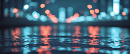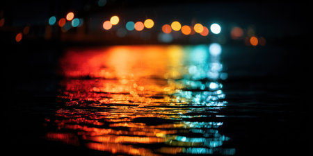 Captivating image showcasing a tranquil water surface illuminated by colorful lights, creating a mesmerizing bokeh effect with gentle ripples.