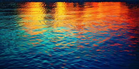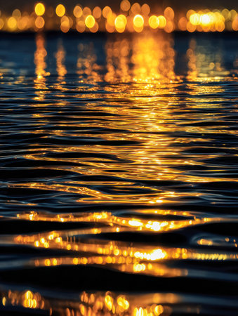 Vibrant water reflections, sunset hues, rippling surface, city lights background