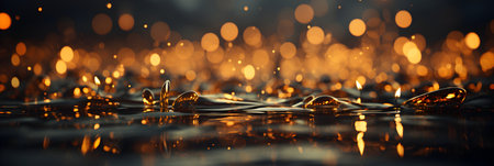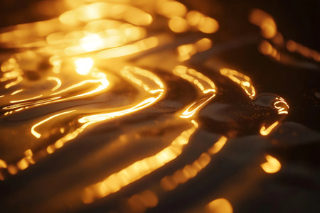 Golden liquid surface shimmering under sunlight, creating mesmerizing ripples and reflecting warm, vibrant hues in an elegant display