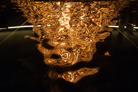 An abstract pattern of firelight and reflections on a glossy surface, with golden swirls and shimmers. A natural and strange background with a contrasting appearance of a shapeless structure