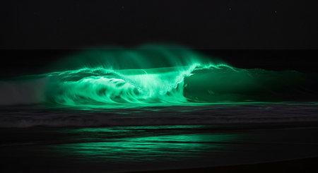 Waves crash with luminous colors at nighttime, creating a stunning display along the shoreline.