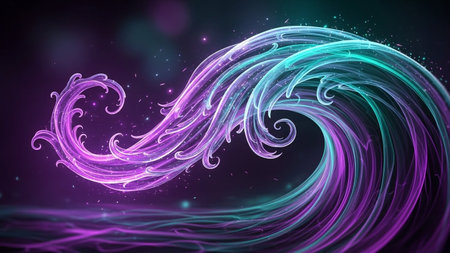 A dynamic and luminous abstract wave of purple and turquoise energy swirls with sparkling particles on a dark...