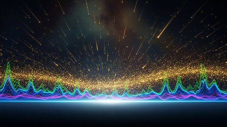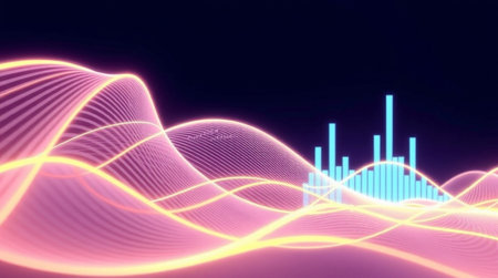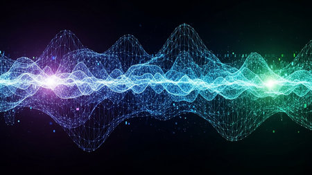 A vibrant digital waveform composed of connected dots and lines pulsates with light bursts of purple, blue,...