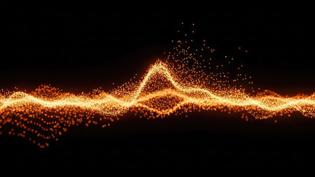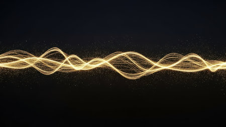 With showing golden glowing wavy lines with tiny particles on a dark background creating an abstract energetic...