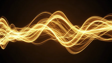 This captivating abstract image features glowing golden light waves, creating a mesmerizing visual effect. Ideal for illustrating technology concepts or artistic themes.