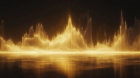 This stunning golden waveform visualization captures the dynamic essence of sound frequencies with intricate patterns and reflections, evoking energy and creativity.