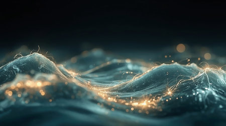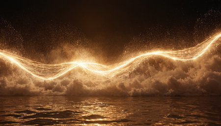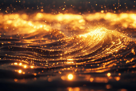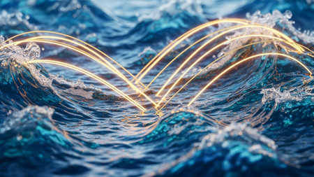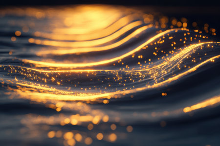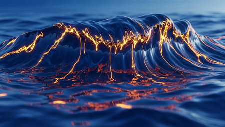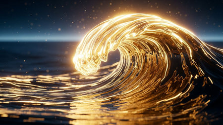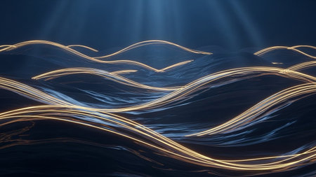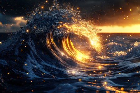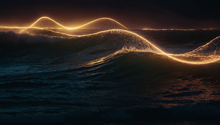 Dark blue ocean waves with luminous golden light trails flowing across their surfaces, illuminated by dramatic blue...