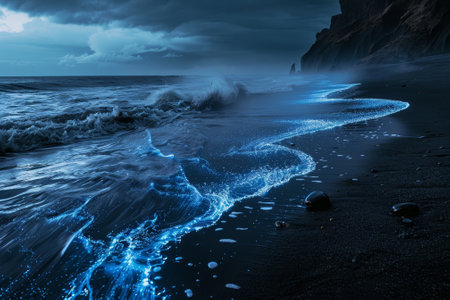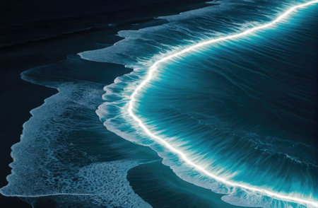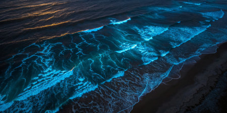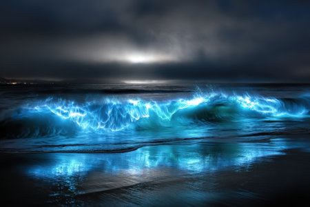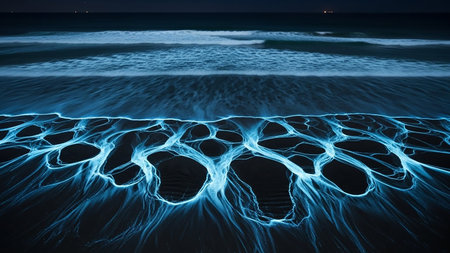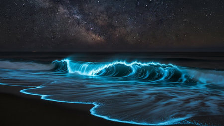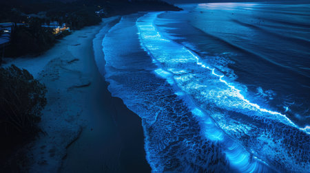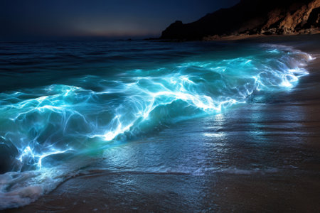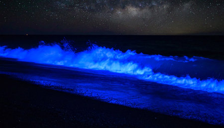 Bioluminescent waves create a mesmerizing display along the beach at night, captivating onlookers.