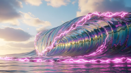 A stunning digital artwork portrays a powerful wave infused with vibrant, electrifying pink energy.