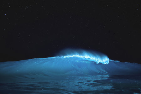 The spectacular ocean waves gently break at night, casting a beautiful blue glow. The starry sky enhances the atmosphere, creating a coastal view. AI Generated