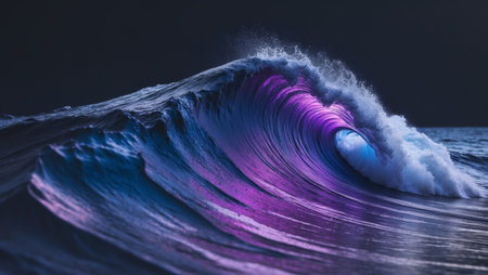A mesmerizing wave curls gracefully, reflecting purple and blue lights at the water's edge during twilight.