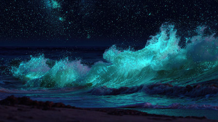 Dramatic ocean waves illuminated with vibrant turquoise hues crash against a dark, sandy shoreline under a stunning star-filled night. The scene captures a dynamic interaction between water and light, creating a visually striking and surreal atmosphere suitable for various artistic and design projects. This imagery can be used for editorial and commercial purposes.