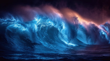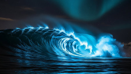 Bioluminescent showing powerful bioluminescent ocean wave cresting and glowing with electric blue light against a...