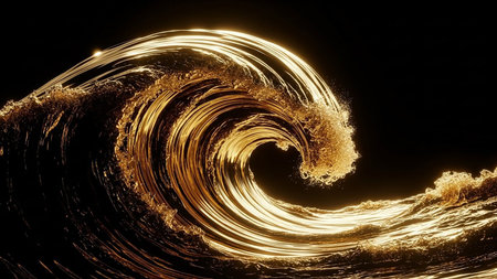3D illustration of a golden wave in the ocean at night.