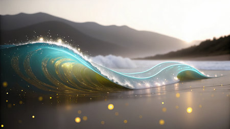 A stylized wave, teal and gold, breaks on a beach. The background shows blurred mountains and a hazy sky. Golden light sparkles on the water and sand. The atmosphere is serene and peaceful. The background appears solid, not transparent.