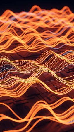 An abstract image of glowing orange wavy lines flowing across a dark, textured surface, creating a sense of energy and digital motion.