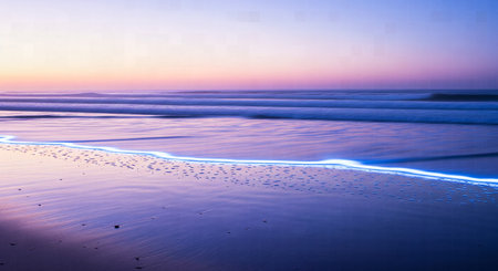 Long Exposure of Ocean Waves with a Glowing Blue-White Line on the Shore at Twilight