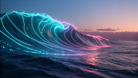 A vibrant ocean wave crests, illuminated with cyan and magenta glowing lines.