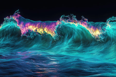 A breathtaking ocean wave crashes at night, radiating bright colors with shimmering reflections in the water.