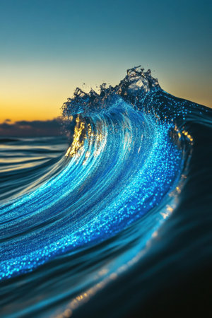 Glowing blue bioluminescent plankton illuminates a breaking wave in the ocean at sunset, creating a magical and surreal scene