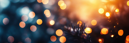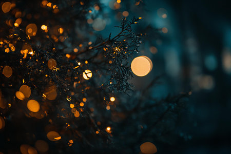 A mesmerizing image that could enhance the ambiance in any room or serve as a backdrop for festive season campaigns | This photograph exudes a moody yet warm atmosphere as the droplets on pine branches glistening amidst a backdrop of circular golden bokeh. The interplay of light and dark creates an intimate setting, invoking a sense of tranquility and magic often associated with twilight scenes. The minute details of water droplets are captured with precision, reflecting the subtle glow of lights, which gives the image a soft, jewel-like quality. The cool blue tones of the blurred background contrast with the warmth of the lights, suggesting the chill of a rainy evening tempered by the cozy luminescence of streetlamps or festive decorations. The depth of field is shallow, making the pine needles and water droplets the clear focal points and enveloping the viewer in an almost surreal, dream-like vignette | Suitable for a variety of uses, from jazzing up website backgrounds to adding an element of enchantment to holiday greeting cards. The imagery would be a great fit for home décor during the winter holidays, in boutique windows to evoke a seasonal feel, or in atmospheric restaurants and lounges. It serves as an appealing visual metaphor for comfort in the cold, the joy of the holiday season, or the peace of a quiet evening | an evocative photo of illuminated water droplets on pine needles against a blurry background, imparting an air of warmth and mystique in a cool evening setting, poised for textual or graphical addition