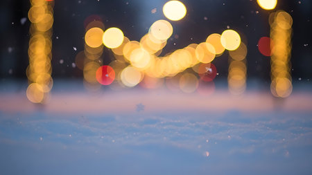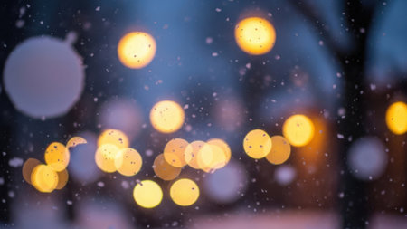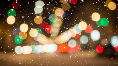 Softly blurred colorful bokeh lights and falling snowflakes create a magical winter night atmosphere with a festive...