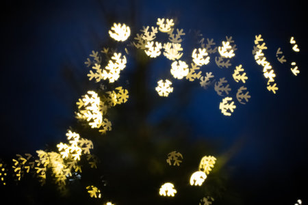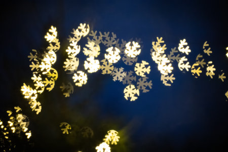 Blurred lights shaped like snowflakes illuminate a dark blue background, creating a whimsical winter ambiance perfect for holiday themes and seasonal celebrations