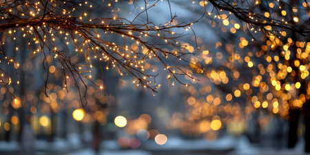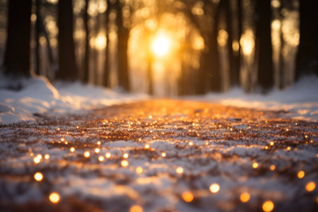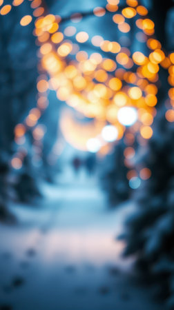 Captivating scene of a snowy street adorned with warm decorative lights creating a magical ambiance. Perfect for evoking a cozy holiday feeling.