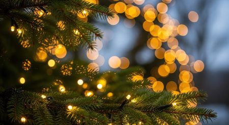 Christmas tree branches with lights bokeh background. Merry Christmas and Happy New Year.