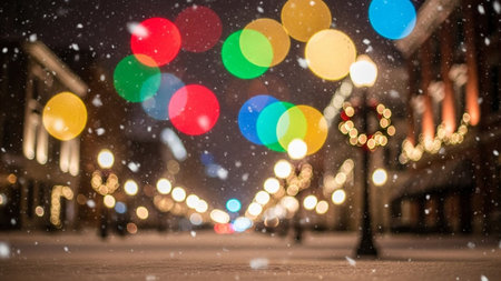 Winter brings soft snowfall to city streets, where colorful lights hang overhead, creating warm and festive atmosphere. Bokeh effect from the lights adds whimsical touch, highlighting joy of season.