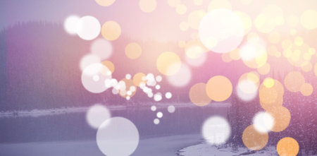 Soft focus winter landscape with glowing bokeh lights at dusk over snow covered ground