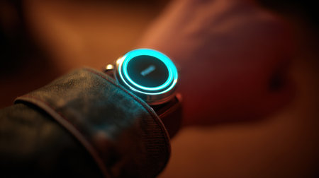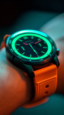 Close view of a modern smartwatch featuring a luminous screen, worn on a hand in a dimly lit environment, showing its sleek design.
