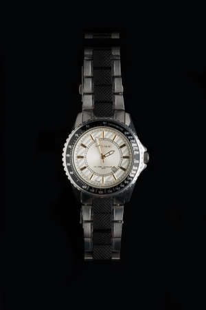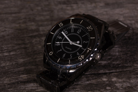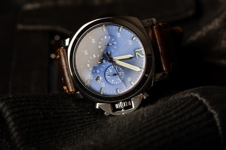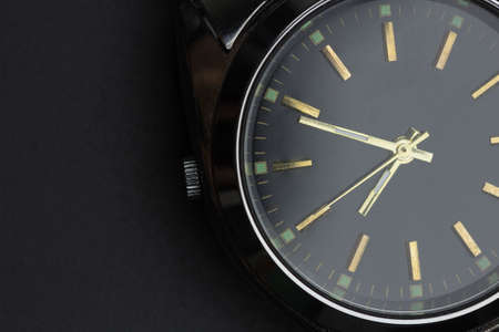 Black metal wristwatch with dark dials against a crisp lit background. High quality photo