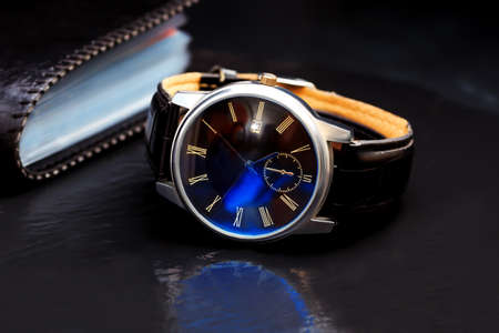 elegant stylish Men's Watch and business card holder or purse on black table close-up