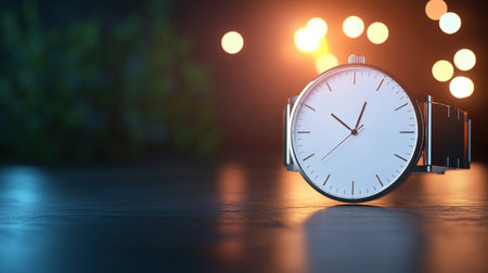 A close-up shot of a wristwatch placed on a dark, reflective surface with blurred bokeh lights creating a soft, ambient glow in the background.