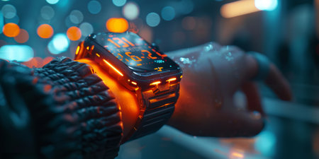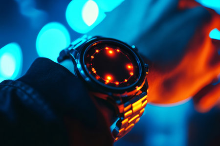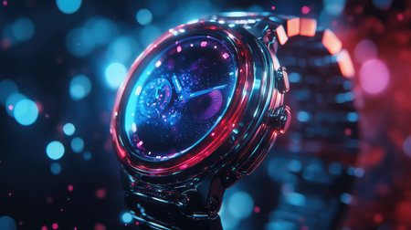 Wristwatch glowing with red lights while displaying notifications in a vibrant, futuristic neon setting, highlighting advanced technology and connectivity