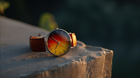 Detailed close-up of a round wristwatch, featuring a gradient face from orange to red, resting on a stone surface. The watch has a brown leather band. Natural light highlights the watch's design elements.