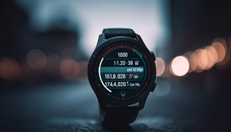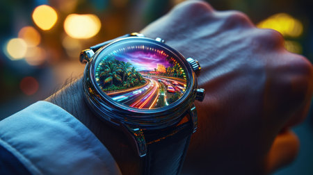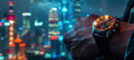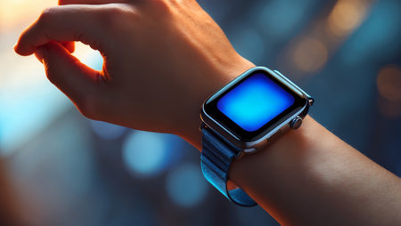 Modern smartwatch displays vibrant blue screen on wrist in urban setting during evening hours