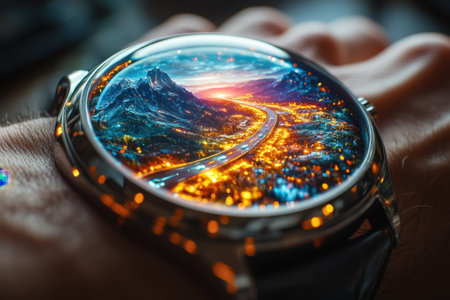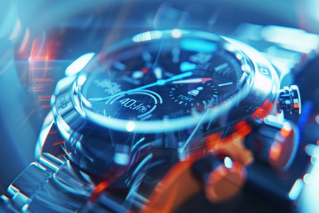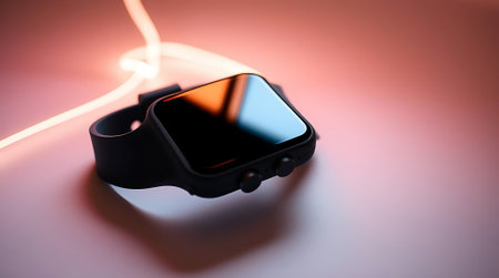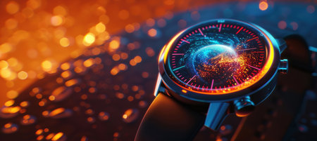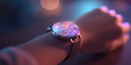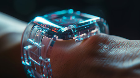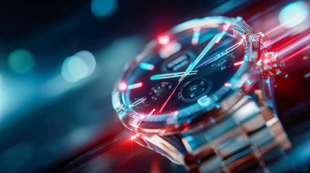 Futuristic smartwatch with glowing holographic display and light trails, symbolizing innovation in wearable technology.