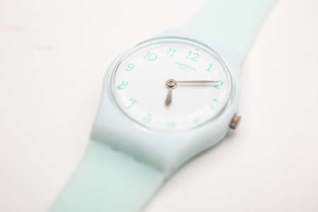 London, GB 07.10.2020 - Swatch cheapest swiss made quartz watch isolated on white background. white plastic case, green number markings on dial, Green technology time concept. Swatch Group production